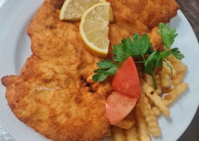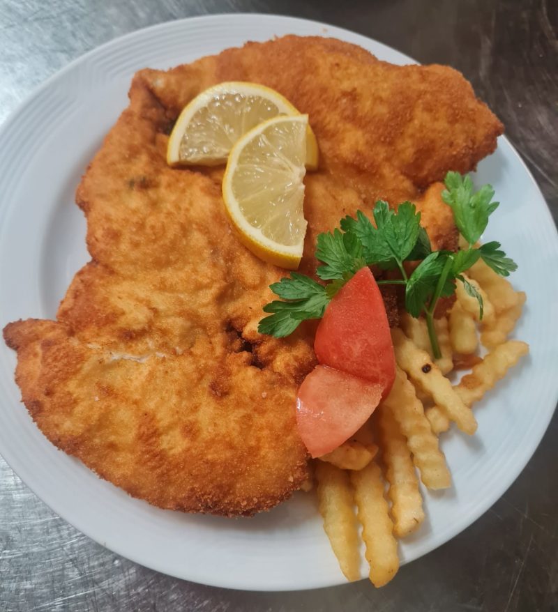 Schnitzel Wiener Art vom niederbayrischen Strohschwein mit Pommes 1, 2, 6, 10 |